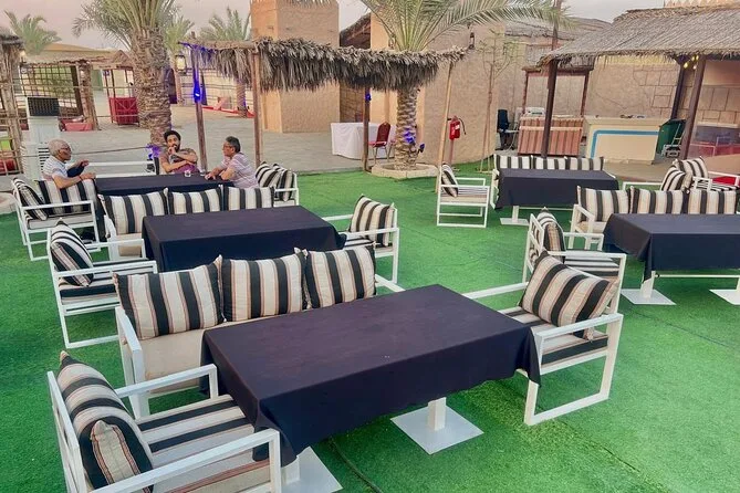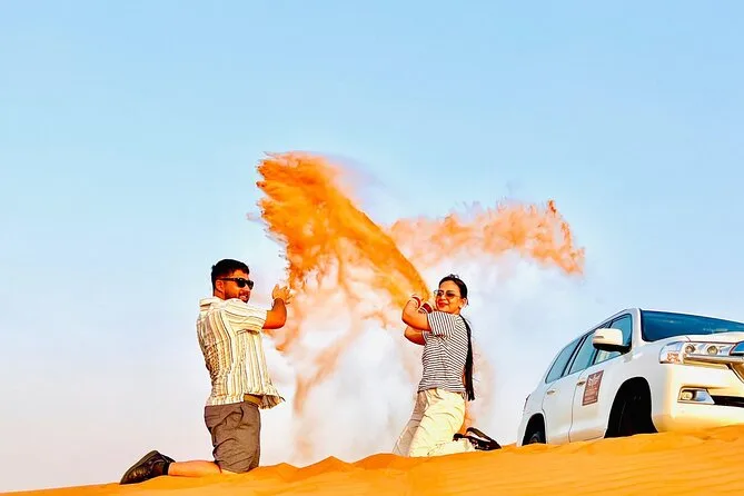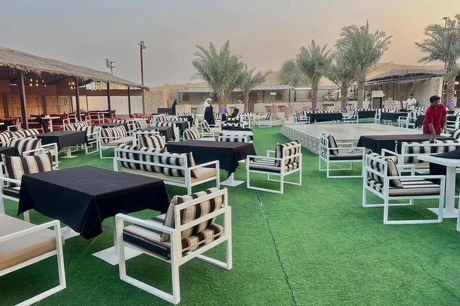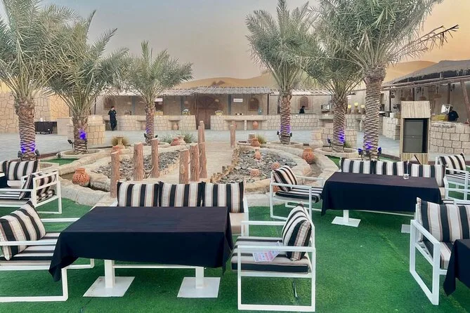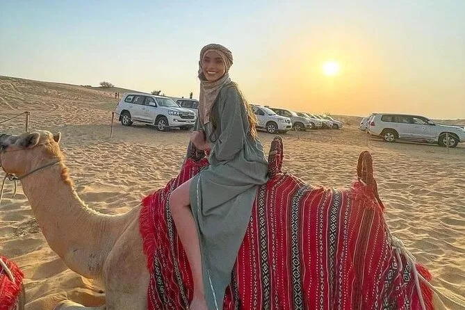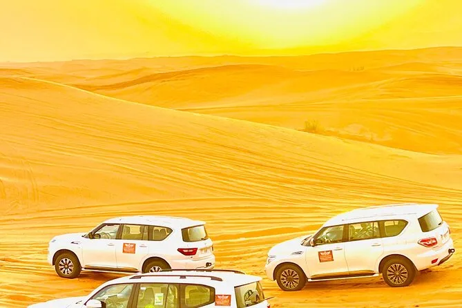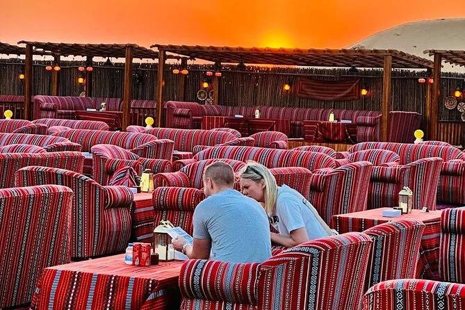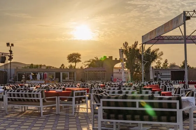 Votre soirée comprend la prise en charge et le retour en 4x4 partagé depuis votre hôtel ou résidence à Dubaï, un accès premium à un camp de luxe style bédouin avec espaces confortables, un dune bashing palpitant avec des chauffeurs expérimentés, du sandboard sur les dunes dorées, des balades à dos de chameau pour tous, de l’eau à volonté ainsi que thé et café pendant toute la durée. Un dîner buffet live propose plus de trente plats végétariens et non végétariens, accompagnés de douceurs émiraties traditionnelles ; sans oublier les spectacles en live — danse du ventre, Tanoura, feu — et même un feu d’artifice avant le retour sous un ciel étoilé.