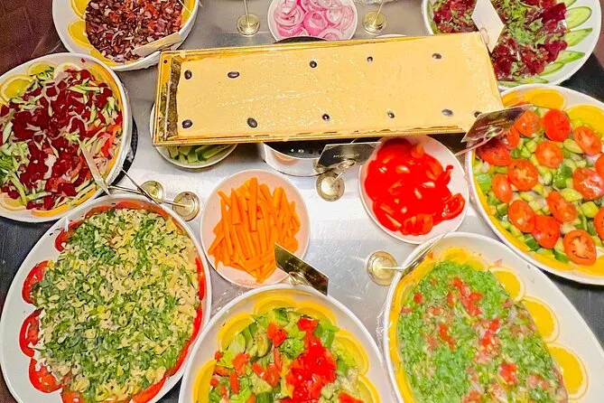 Un dîner buffet en direct avec 32 plats, incluant des options végétariennes et non-végétariennes.