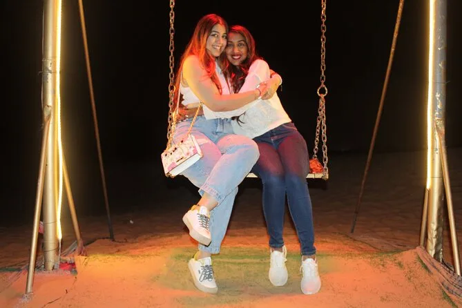 Votre soirée inclut un transfert privé aller-retour en 4x4 depuis Dubaï ou ses environs ; toutes les sessions de dune bashing ; le sandboard ; les balades à dos de chameau ; les arrêts photos au coucher du soleil ; l’entrée dans un camp traditionnel avec café arabe et dattes ; la peinture au henné ; la chicha dans un espace dédié ; les photos en tenue traditionnelle ; ainsi qu’un buffet BBQ complet avec options végétariennes et viande, accompagné de danses du ventre, danse Tanoura et spectacle de feu avant le retour tardif.
