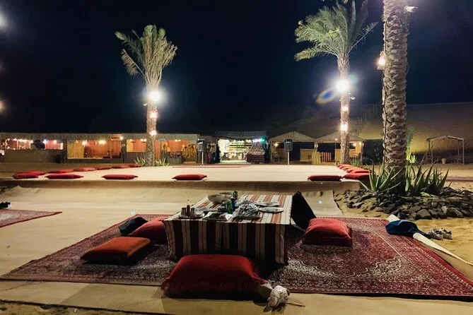 Votre soirée comprend la prise en charge à l’hôtel en Land Cruiser climatisé, le dune bashing près de Maleha avec arrêts photos, la visite d’une ferme de chameaux et un spectacle de faucons avec interactions, un moment photo au camp au coucher du soleil avec café arabe et dattes à l’arrivée. Vous pourrez essayer le sandboard (en supplément), faire une courte balade à dos de chameau, vous faire tatouer au henné et fumer la chicha avant de profiter de boissons à volonté et d’un dîner barbecue avec plats végétariens et non-végétariens — le tout ponctué par des danses Tanoura, un spectacle de feu et de la danse orientale sous le ciel ouvert du désert.