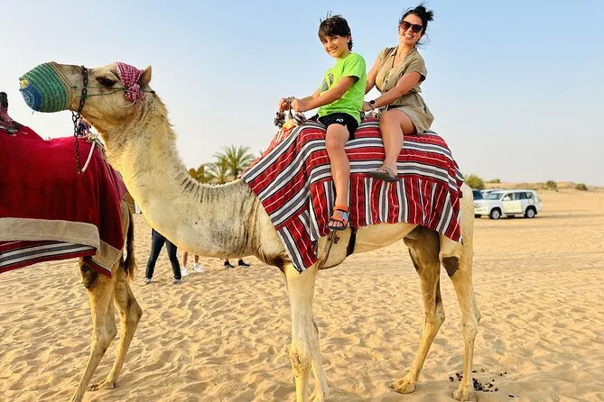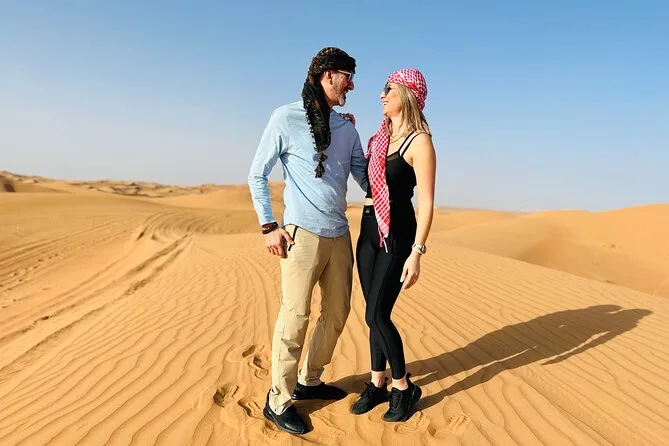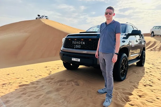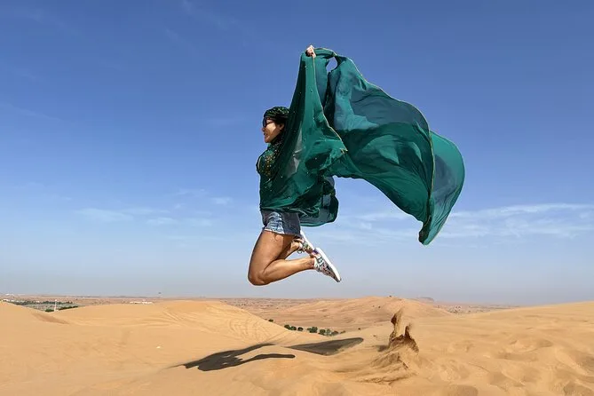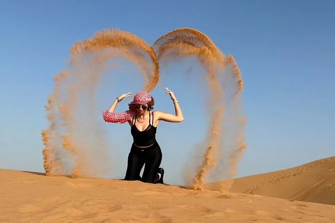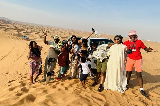 Dune bashing en 4x4 Land Cruiser, sandboard, balades à dos de chameau, spectacles live, shisha, tatouages au henné et photos au coucher du soleil (selon météo).