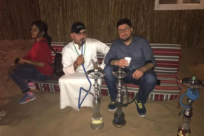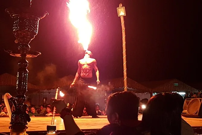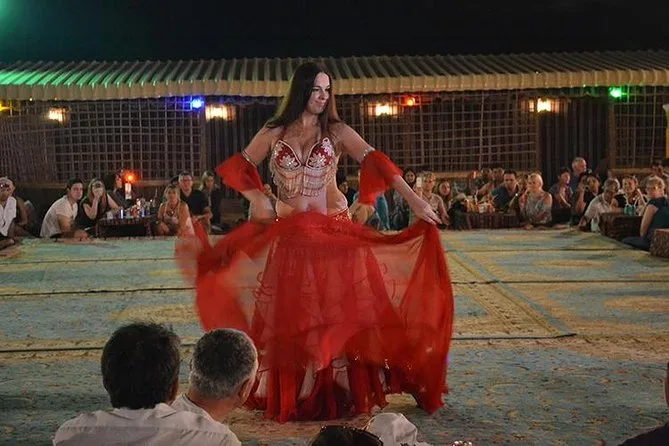 Votre soirée inclut la prise en charge et le retour à l’hôtel par un guide anglophone en 4x4 Land Cruiser partagé (ou transfert privé en option), un dune bashing palpitant dans les dunes rouges de Lahbab avec sessions gratuites de sandboard, des balades courtes à dos de chameau que vous pouvez refaire pour plus de photos (même en costume local), accès à la photo au coucher du soleil selon météo et timing, ainsi que toutes les activités du camp comme la shisha (zones dédiées), tatouages au henné pour les femmes, service traditionnel de café arabe avec snacks à l’arrivée, suivi d’un dîner buffet BBQ avec plats végétariens et non-végétariens et boissons à volonté — puis profitez des spectacles de danse orientale (hors Ramadan), des danses Tanoura et shows de feu avant de repartir en ville tard le soir.