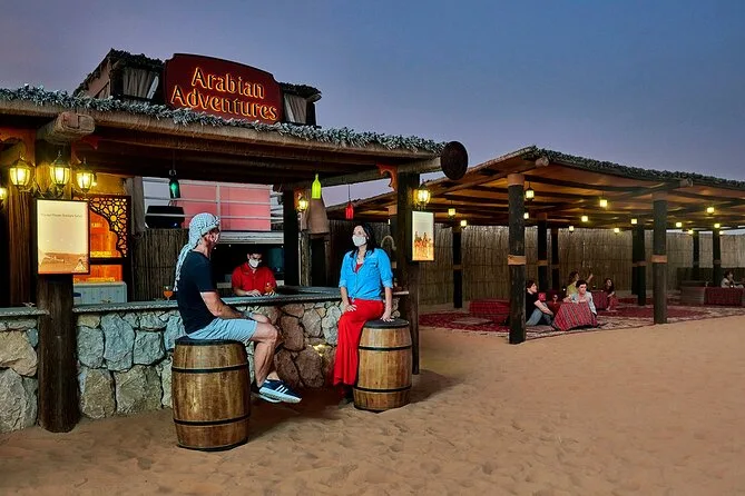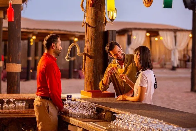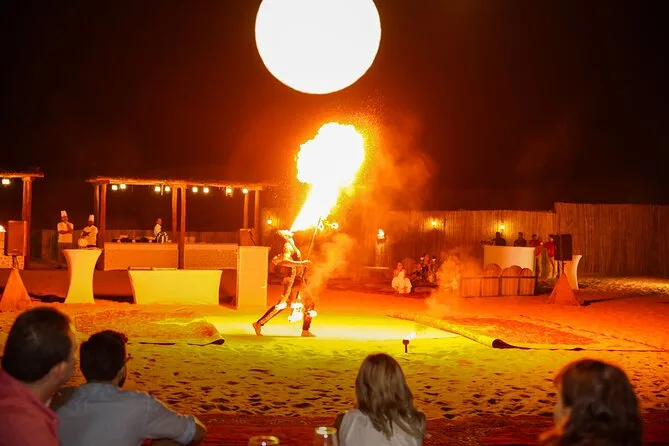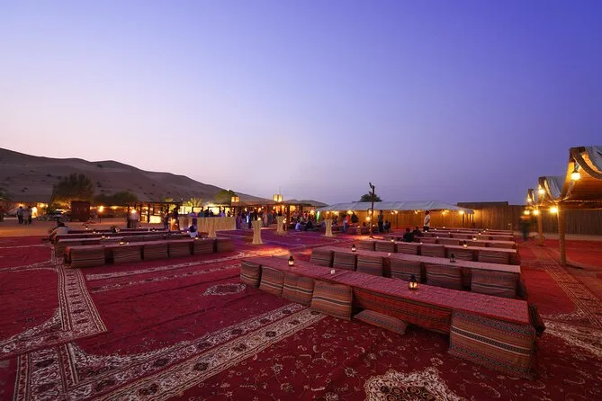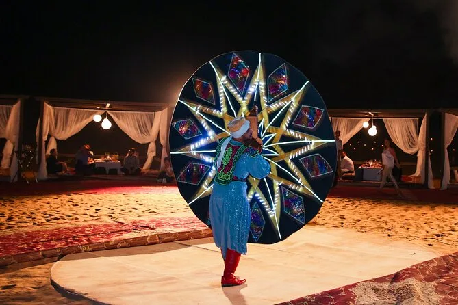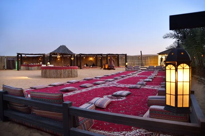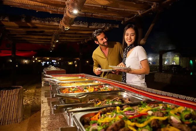 Votre soirée comprend la prise en charge et le retour à l’hôtel en 4x4 avec un chauffeur expérimenté, toutes les activités comme le 4x4 dans les dunes rouges, la balade à dos de chameau avec des locaux, le matériel de sandboard fourni sur place (apportez juste votre bonne humeur), le tatouage au henné au camp, ainsi que boissons fraîches et jus à volonté. Le dîner est un buffet BBQ régional sous le ciel ouvert, accompagné de spectacles vivants avant le retour à l’hôtel.