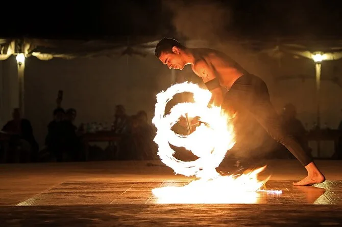 Au moment du dîner, tout le monde semblait plus détendu. Des assiettes bien remplies de poulet et d’agneau grillés, du riz parfumé, des salades à la menthe—j’ai sûrement trop mangé, mais c’était impossible de résister. Un spectacle de feu a enflammé la soirée, déclenchant les applaudissements (j’ai sursauté quand les flammes ont jailli), suivi de danseurs en costumes colorés. La nuit a vite rafraîchi l’air ; j’ai resserré ma veste et regardé la fumée s’élever du salon chicha pendant que les gens discutaient doucement sous les guirlandes lumineuses. C’était à la fois animé et paisible—je repense encore à ce silence entre deux chansons.
