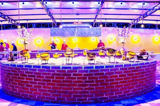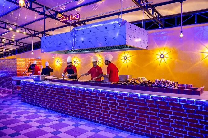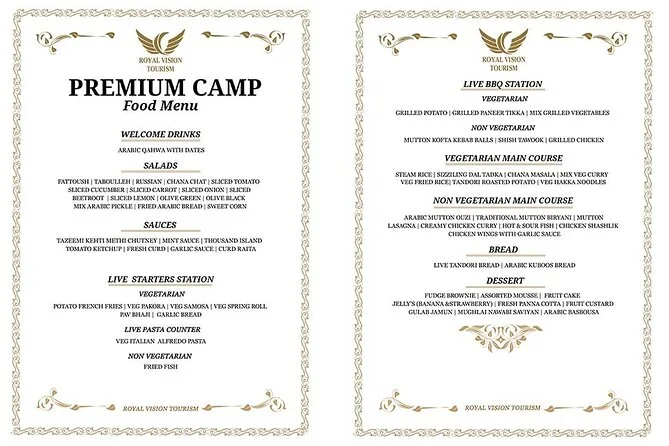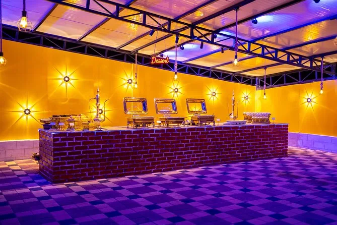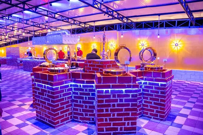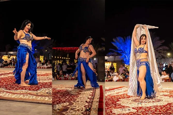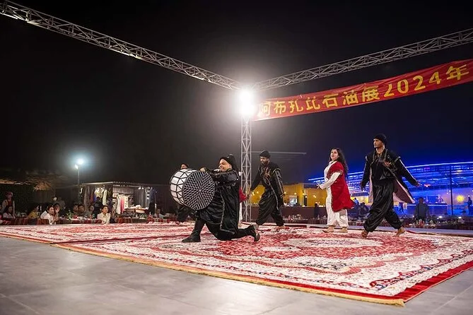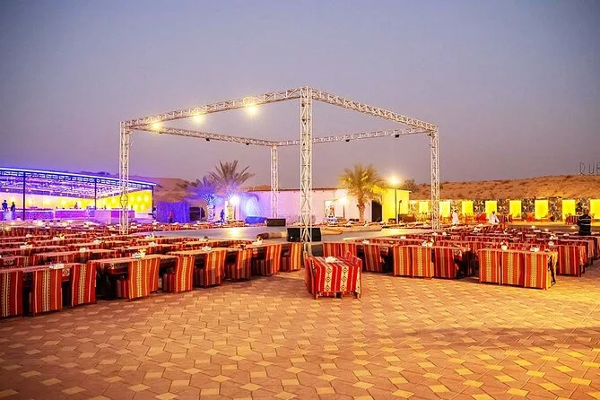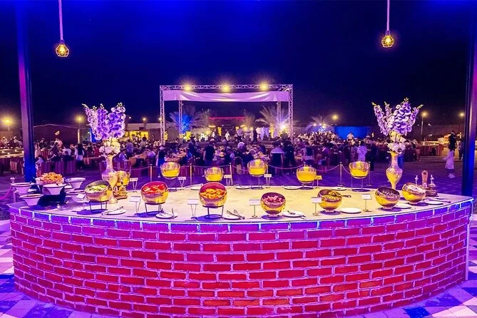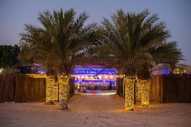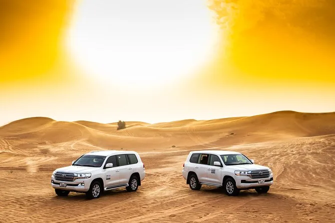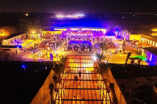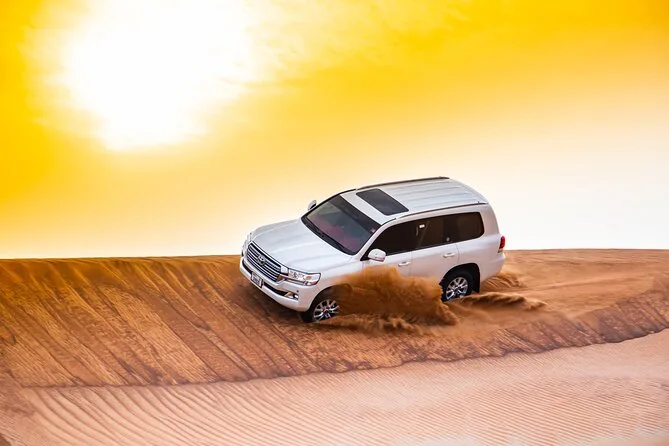 Votre journée comprend la prise en charge et le retour à l’hôtel par des chauffeurs professionnels en Land Cruiser 4x4 (transfert partagé), un dune bashing palpitant sur les dunes rouges d’Al Lahbab, des sessions de sandboard, des arrêts photos au coucher du soleil, une balade à dos de chameau avec beaucoup de temps pour les photos, un buffet international à volonté avec options végétariennes et non végétariennes, ainsi que boissons non alcoolisées et eau minérale à volonté. Vous dégusterez aussi café arabe, thé et dattes à l’arrivée au camp, avec des séances de henné et six spectacles live avant de repartir sous les étoiles.