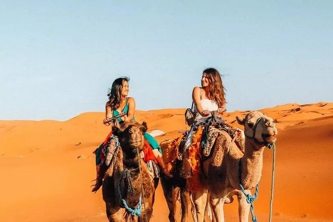 Vous profiterez de balades à dos de chameau, sandboard, henné, photos en tenue traditionnelle, spectacles de danse, café arabe et douceurs.