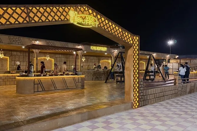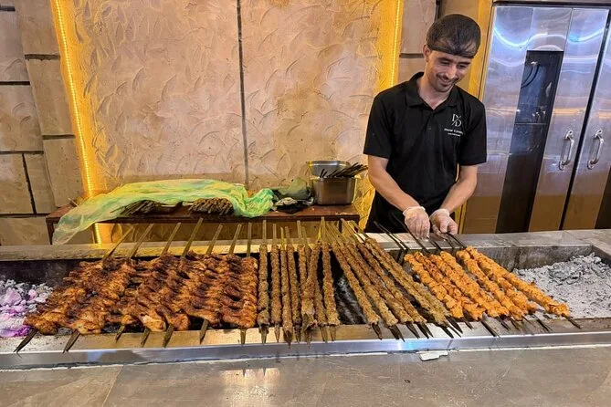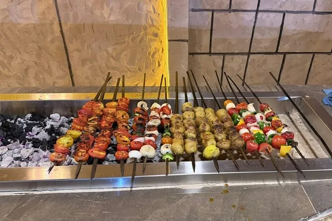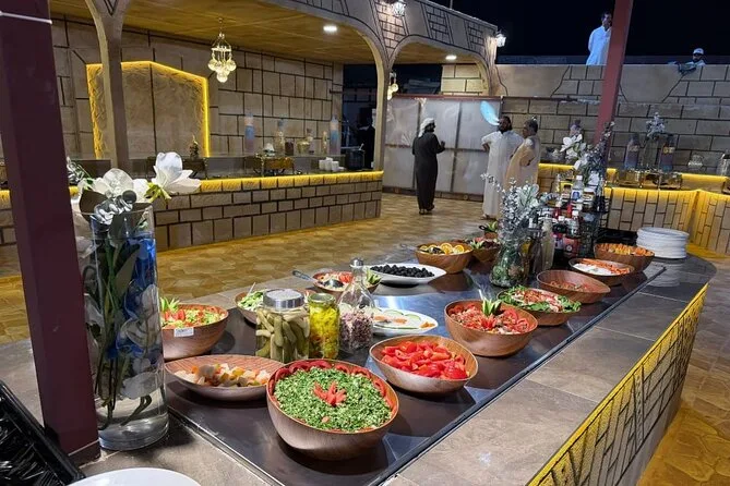 Le dîner propose une cuisine arabe traditionnelle sous forme de buffet BBQ avec viandes grillées et accompagnements.