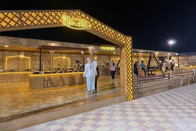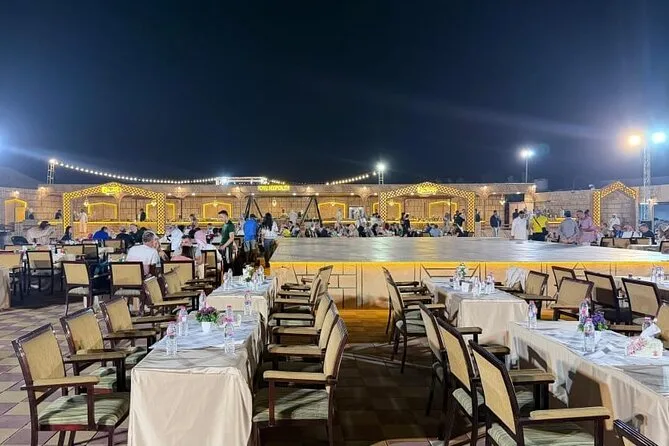 Le safari du soir comprend environ 35-40 minutes de dune bashing, plus du temps pour le quad, la balade à dos de chameau, le dîner et le spectacle ; comptez plusieurs heures au total avec les transferts.