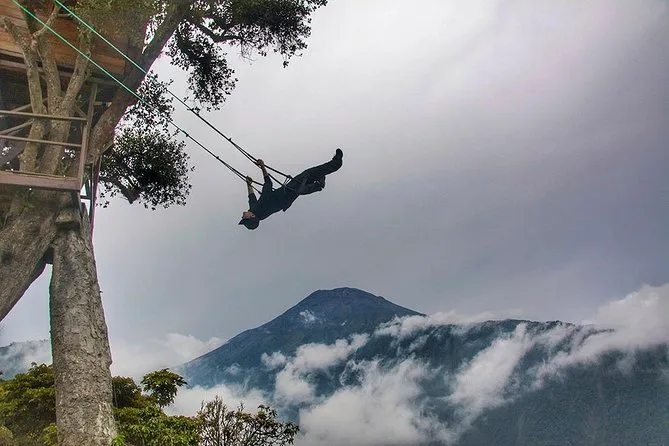 De retour en ville pour le déjeuner (j’ai pris des empanadas chez un vendeur ambulant), puis direction la Casa del Árbol pour la fameuse balançoire au bout du monde. Ce n’est pas aussi effrayant que ça en a l’air — sauf si vous avez le vertige ! Le reste de l’après-midi était libre ; je me suis baladé sur la place principale de Baños où les enfants couraient après les pigeons et les vendeurs proposaient du jus de canne à sucre.