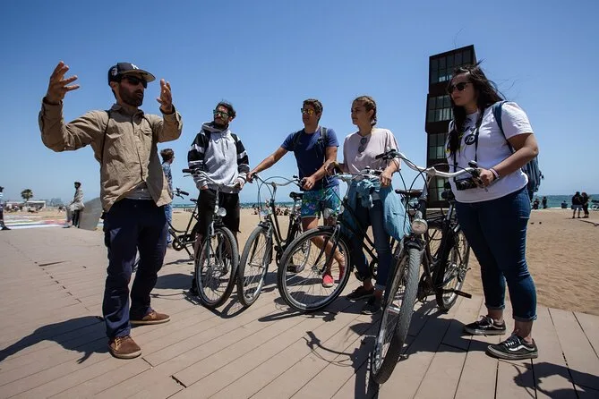La première chose qui m’a frappé en pédalant dans Poblenou, c’est le calme—juste le doux bruit de nos roues et quelques locaux discutant devant la boulangerie Forn Baluard. Les rues sont larges, bordées de maisons de pêcheurs blanchies à la chaux, et si vous êtes matinal, vous pouvez encore sentir la brise salée de la mer. Notre guide, Marta, nous a montré la Torre Glòries qui dépasse des toits—les habitants l’appellent « le concombre », ce qui nous a bien fait rire. Elle connaissait tous les raccourcis sur des pistes sans voitures et nous a même fait découvrir une fresque cachée derrière une aire de jeux, que je n’aurais jamais vue seul.