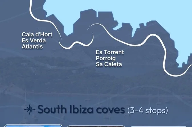 La sortie dure toute la journée avec plusieurs arrêts sur la côte sud d’Ibiza, notamment Es Torrent, Atlantis et Es Vedrà, avant de revenir à Cala Jondal.
