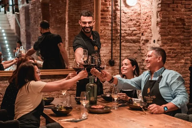 Votre soirée comprend un atelier pratique de tapas animé par un chef pro en plein centre de Madrid, tous les ingrédients fournis à votre poste, un accord illimité de cinq vins espagnols, puis un dîner 6 plats avec vos créations, plats principaux et dessert — le tout autour d’une grande table conviviale avant de repartir dans la nuit madrilène.
