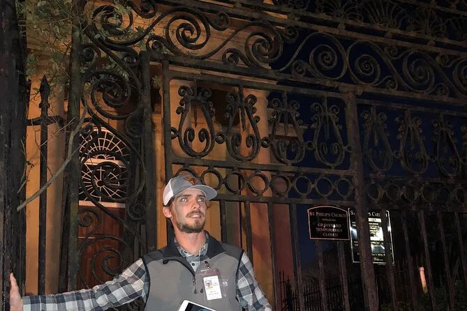 Votre soirée comprend des balades guidées dans les rues historiques de Charleston avec deux arrêts dans des bars (le premier avec apéritifs offerts), des histoires de fantômes racontées par un guide local de longue date, des vues proches sur des cimetières célèbres comme Circular Congregational Church (sans y entrer), et se termine dans un parc légendaire où se déroulaient autrefois des exécutions publiques.