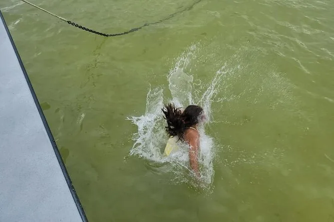 Je ne m’attendais pas à ce que Crab Island soit aussi… animée ! Des bateaux partout, des rires, de la musique flottant sur l’eau. On ne s’est pas arrêtés mais on s’en est approchés pour bien voir avant de repartir plus loin dans le Golfe. Jamie nous a montré où les lamantins apparaissent parfois (pas de chance pour nous), et nous a raconté comment les locaux surveillent les requins — apparemment, ils sont plus timides qu’on ne le croit. Tout ça avait un côté décontracté, comme si on était avec des amis qui savent vraiment ce qu’ils font.