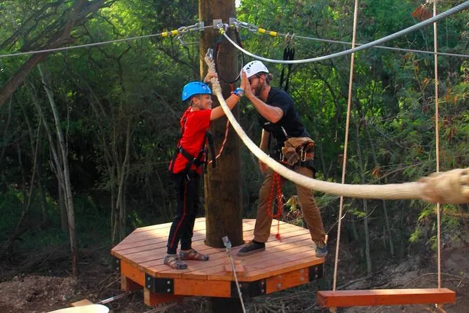 La première chose qui frappe, c’est la brise — douce, mais avec ce petit goût salé venu de la mer. On s’est enregistré une trentaine de minutes avant notre créneau, juste le temps d’observer un groupe devant nous, à la fois nerveux et excité, en train d’attacher leurs harnais. Les guides sont super sympas, ils plaisantent tout en vérifiant chaque sangle et boucle avec sérieux. Depuis le sol, on voit tout le parcours : cordes, planches qui se balancent, et ces ponts branlants qui paraissent simples… jusqu’à ce qu’on soit dessus.