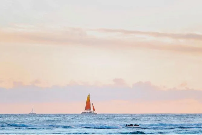 Vivez le pouls de Waikiki en embarquant pieds nus pour une croisière en catamaran au coucher du soleil avec boissons à volonté et ambiance chaleureuse. Savourez des cocktails locaux tandis que les lumières de la ville scintillent derrière Diamond Head et que les rires résonnent sur le pont. Avec open bar inclus et embarquement facile depuis la plage, c’est plus fun que formel — n’oubliez pas votre esprit d’aventure.