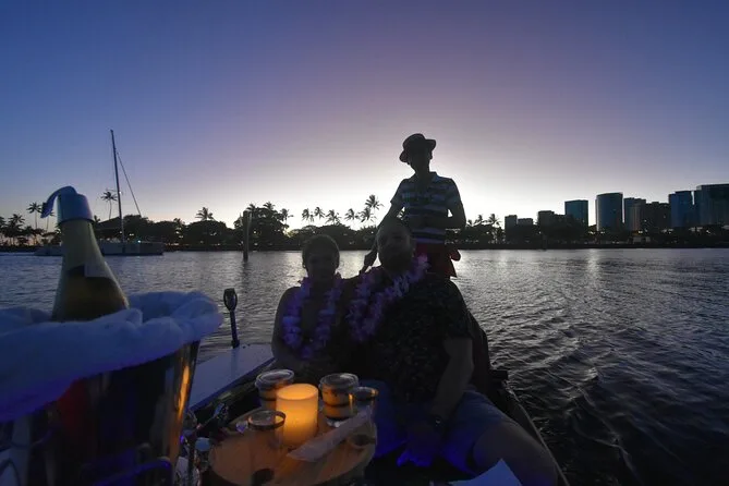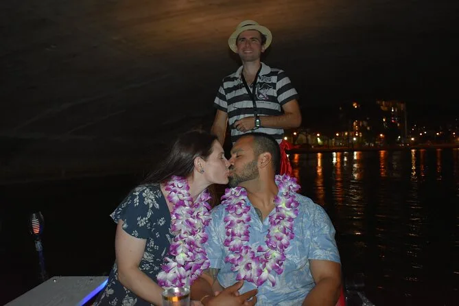 Glissez sur le canal de Waikiki à bord d’une gondole vénitienne avec un guide local, accueilli par un lei frais et des pâtisseries sucrées. Vous passerez près de Magic Island, admirerez Diamond Head, profiterez des lumières de la ville qui dansent sur l’eau, et peut-être d’un petit spectacle laser — le tout bercé par la douce brise hawaïenne.