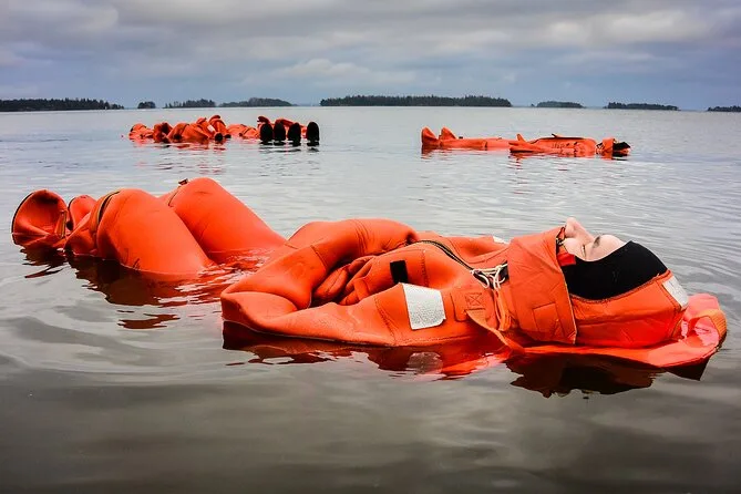 Me jeter dans la Baltique en mars, c’était pas dans mes plans, mais voilà, on flottait là, comme des bouées. La combinaison garde au sec et au chaud — c’est étonnamment rassurant, un peu comme être enveloppé dans un sac de couchage qui flotte. Jukka nous a expliqué comment les équipes de secours utilisent ces combis et a parlé de l’hypothermie (il ne lisait pas un texte, on sentait qu’il connaissait vraiment son sujet). À un moment, je me suis juste allongé sur le dos, regardant le ciel bleu pâle traversé de nuages, essayant d’imaginer ce que doit être la nage hivernale pour les locaux. Un silence s’est installé, je n’entendais plus que ma respiration dans la cagoule.