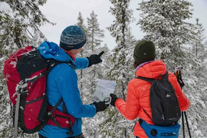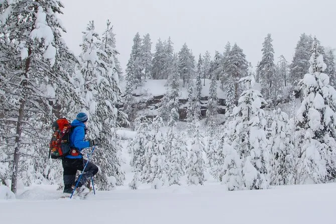 Votre séjour comprend la prise en charge depuis Rovaniemi ou villes proches, tout l’équipement de raquettes et vêtements d’hiver si besoin, des randonnées guidées par un expert local, des repas copieux avec encas cuits au feu de bois, et trois nuits en chalets confortables (dont une avec sauna finlandais traditionnel). Tous les frais et taxes sont inclus pour que vous puissiez juste profiter de la marche — et peut-être rire en essayant votre premier mot finnois au dîner.
