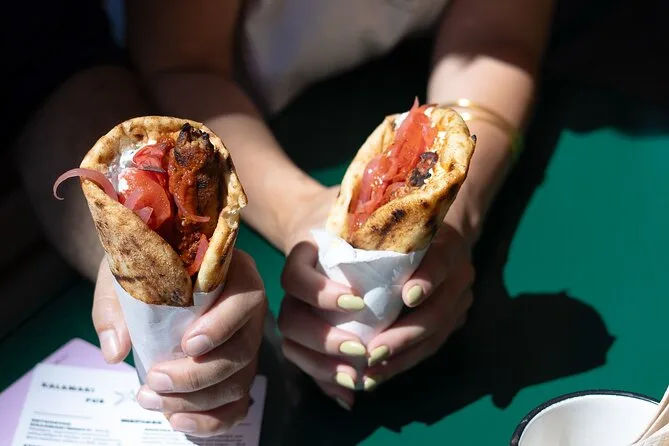 Votre journée comprend toutes les dégustations de street food — du koulouri fraîchement cuit aux spanakopita et peinirli, en passant par un choix de souvlaki ou gyro, et pour finir un dessert de loukoumades. Les boissons (bière ou soft) sont incluses, tous les frais d’entrée sont pris en charge, et un guide local passionné vous accompagne en petit groupe dans les quartiers les plus emblématiques d’Athènes, pour terminer avec une vue imprenable sur la ville.