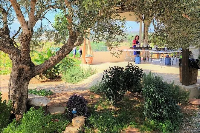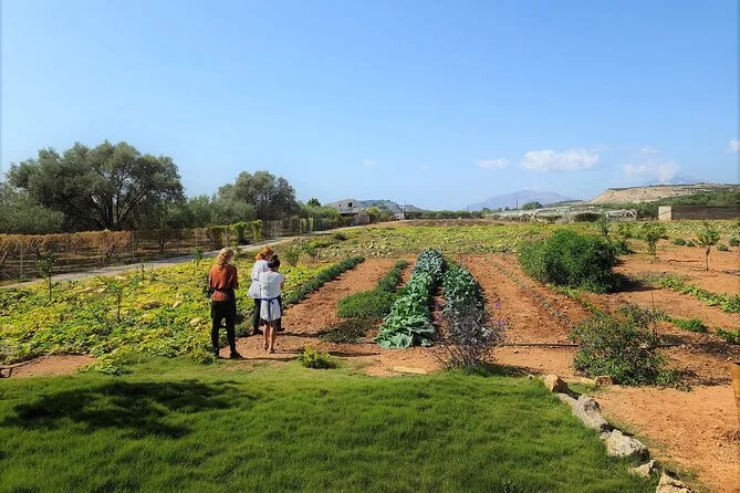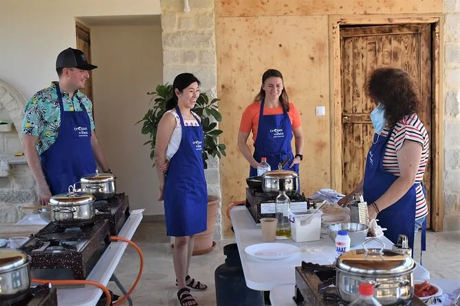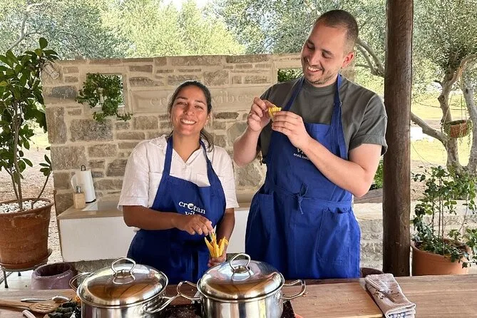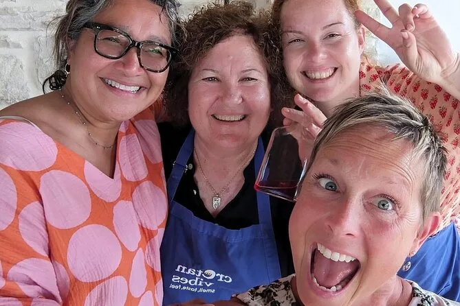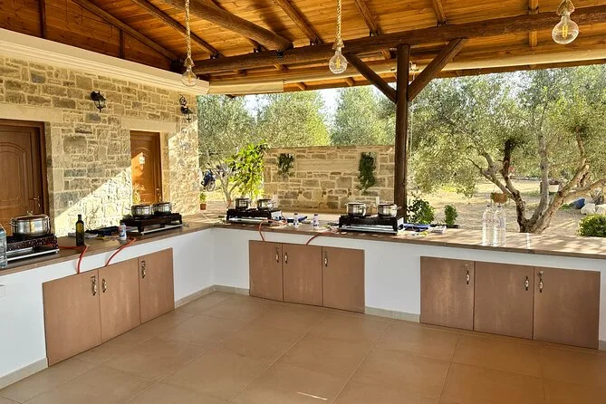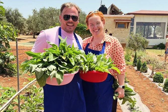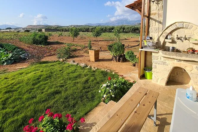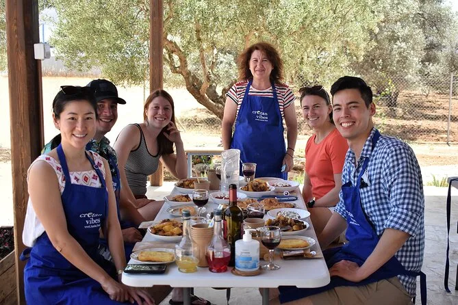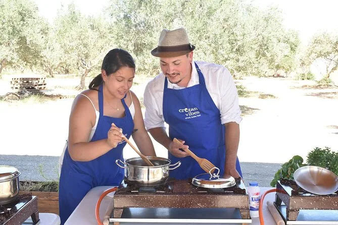 Votre journée comprend tous les ingrédients frais du jardin ou des fermes partenaires, des tabliers pour tous, un accompagnement pratique de Maria et Stella tout au long de l’atelier cuisine crétoise, une dégustation d’huile d’olive extra vierge premium avec conseils d’experts, des rafraîchissements maison comme limonade ou eau, beaucoup de vin local au déjeuner sous les arbres, une vidéo exclusive sur la tradition familiale de la récolte des olives — et les restes soigneusement emballés à emporter. Les recettes vous seront envoyées par email pour prolonger l’expérience chez vous.