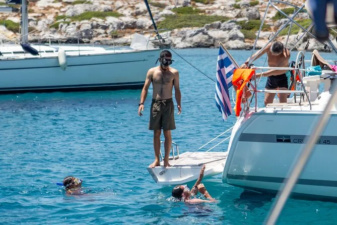 Vous naviguerez d’Héraklion sur les eaux limpides de la mer Égée jusqu’à l’île de Dia, nagerez ou ferez du snorkeling dans des criques paisibles, partagerez des rires avec l’équipage local autour d’un verre de vin crétois, et dégusterez un repas frais sur le pont avant de rentrer au coucher du soleil. Une expérience authentique et relaxante — vous aurez même envie que le retour dure un peu plus longtemps.