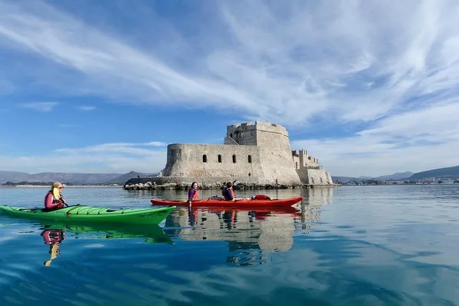 Vous verrez le château de l’île Bourtzi, la forteresse d’Acronafplia de près, et pagayerez sous la forteresse de Palamidi.