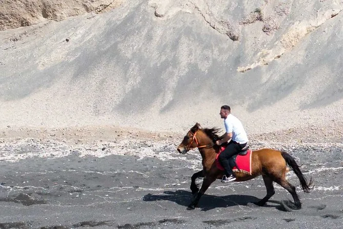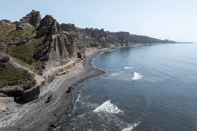 Le sentier vers la caldeira semblait presque irréel — falaises blanches d’un côté, sable noir à perte de vue de l’autre. Nous nous sommes arrêtés à un point de vue où l’on voyait le volcan en face ; Yannis nous a tendu des bouteilles d’eau et a montré comment la lumière illuminait les rochers (« C’est pour ça que les artistes viennent peindre ici », a-t-il expliqué). Le silence régnait, à part le bruit lointain des vagues et un rire derrière moi, parce que je n’arrivais pas à faire tenir mon cheval tranquille pour une photo. Honnêtement, ça ne m’a pas dérangé — parfois, il vaut mieux juste profiter du moment.