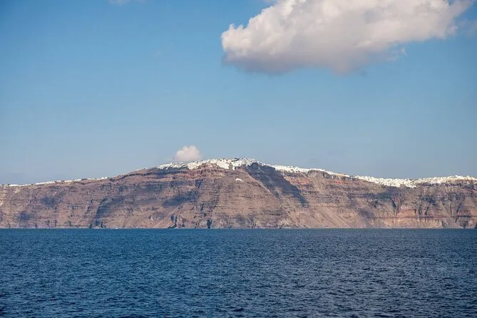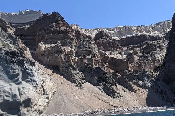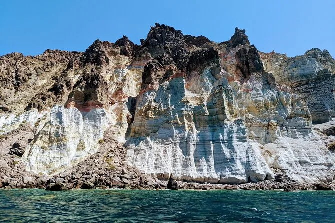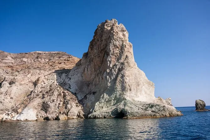 La première chose qui m’a frappé, c’est la couleur — cette falaise rouge rouille de Red Beach qui surgit brutalement de la mer alors qu’on passait à côté. Notre guide, Eleni, nous a expliqué que c’est le fer dans les roches qui teinte tout ici. Le bateau a ralenti pour qu’on puisse prendre des photos (j’ai failli faire tomber mon téléphone, mais je l’ai rattrapé de justesse). On ne peut pas débarquer à Red ou White Beach pendant la croisière, mais franchement, les voir depuis l’eau, c’est presque mieux. Il y a un silence presque sacré quand tout le monde admire ces couches de roche étranges et qu’on réalise l’âge de cette île.