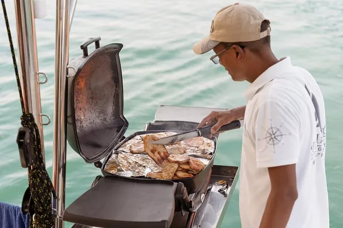 Le déjeuner était simple mais savoureux : poulet grillé, pâtes à la sauce tomate, salade grecque bien relevée à l’origan. On a versé du vin blanc local dans des gobelets en plastique et l’ambiance s’est détendue — quelqu’un a tenté de m’apprendre à dire « Yamas ! » (à la vôtre), j’ai sûrement massacré la prononciation. Les rires résonnaient sur l’eau pendant que l’équipage grillait et passait le pain avec du tzatziki. Je repense encore à cette odeur mêlée d’air salé et de fumée de barbecue.