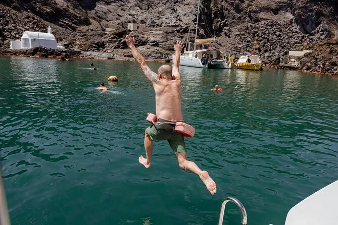 Passer devant Indian Rocks donnait presque une impression irréelle — ces formes dentelées qui sortent de l’eau comme des sculptures qu’aucun artiste n’aurait planifiées. Eleni nous a raconté des histoires de pirates qui se cachaient là (elle jure que c’est vrai). On s’est aussi approchés du volcan ; elle a expliqué comment Santorin doit sa forme à cette énorme explosion il y a des siècles. Aux sources chaudes, il faut vraiment nager un peu pour profiter du bain sulfuré — j’ai hésité, mais j’ai fini par plonger. L’odeur est… disons inoubliable. Par contre, ma peau est devenue étonnamment douce après.