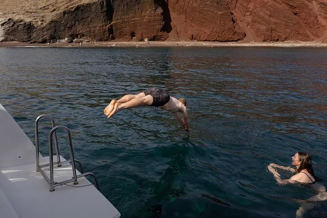 Embarquez pour une croisière en catamaran le long des côtes spectaculaires de Santorin, avec vues sur Red Beach et White Beach, baignade près des sources volcaniques, et un déjeuner BBQ grec accompagné de vin. Transferts hôtel inclus, avec plein de moments où le temps semble suspendu sur la mer Égée.