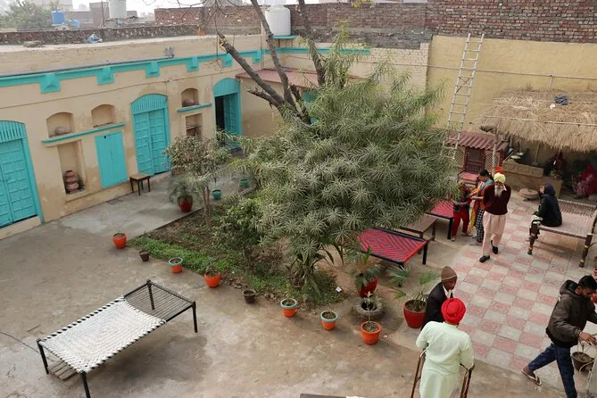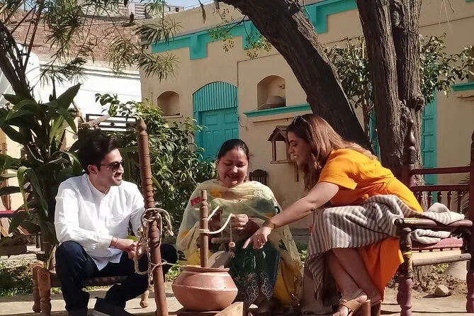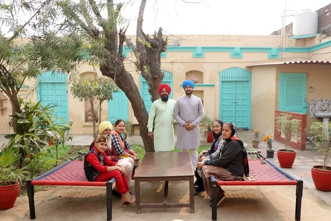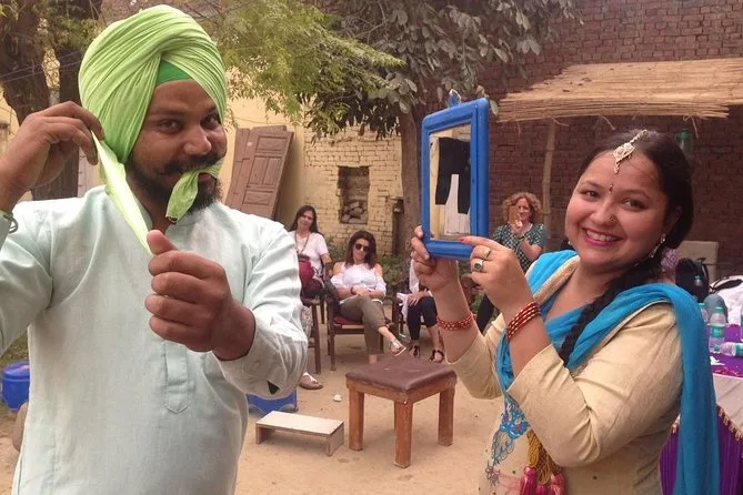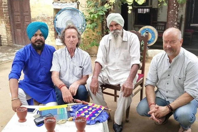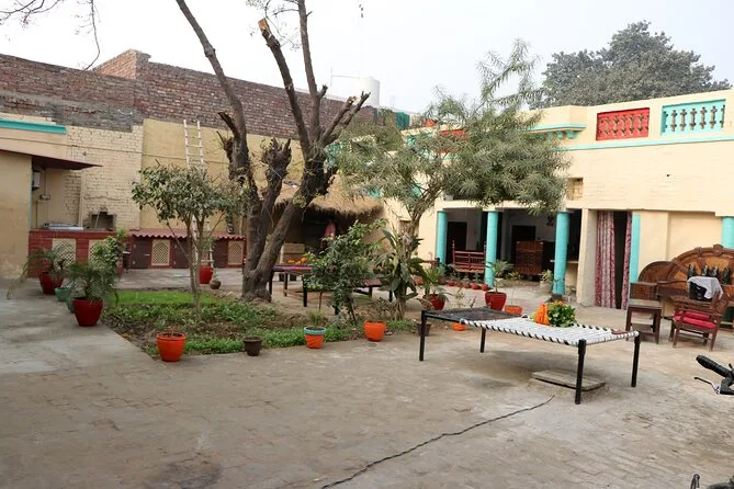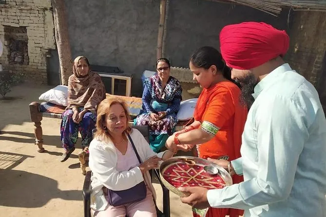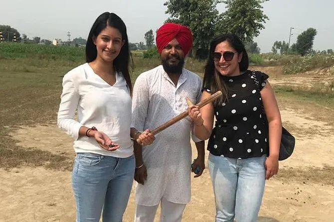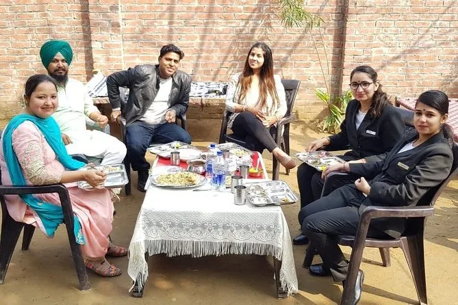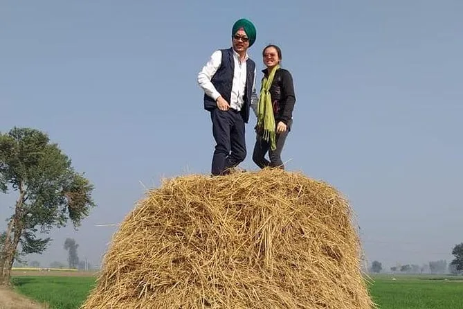 Votre journée comprend un lassi épais de bienvenue, des snacks comme des pakoras servis avec thé au jaggery à l’ombre des arbres, des activités pratiques comme la traite des vaches, l’essai du turban et du mehndi, ainsi qu’un généreux déjeuner maison punjabi avec sarson ka saag, makki di roti, dal makhni et kheer en dessert, avant de repartir revigoré.