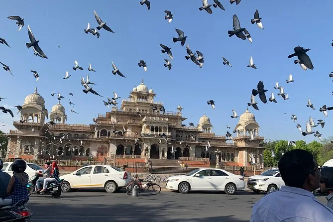 La visite comprend le Fort d’Amber (avec la salle Sheesh Mahal), Jal Mahal (Palais de l’Eau), Hawa Mahal (Palais des Vents), l’observatoire Jantar Mantar, le City Palace et un arrêt photo au musée Albert Hall.