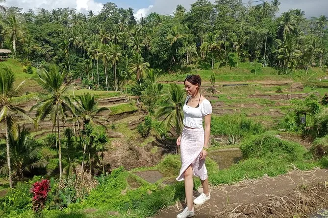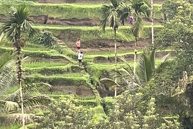 Ensuite, nous avons rejoint les rizières de Tegalalang, juste au moment où le soleil commençait à chauffer. Les champs brillaient de verts et d’or, en terrasses descendant vers la rivière en contrebas. Nous avons arpenté les sentiers étroits entre les rizières, salués par les fermiers en bahasa. Mes chaussures se sont couvertes de boue, mais peu importait — chaque recoin ressemblait à une carte postale, avec l’odeur fraîche de l’herbe mouillée et de la terre.