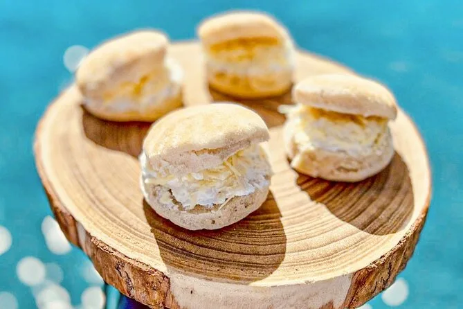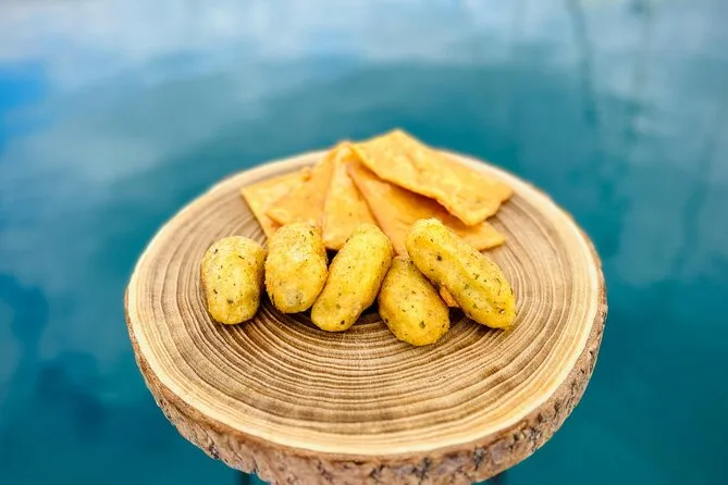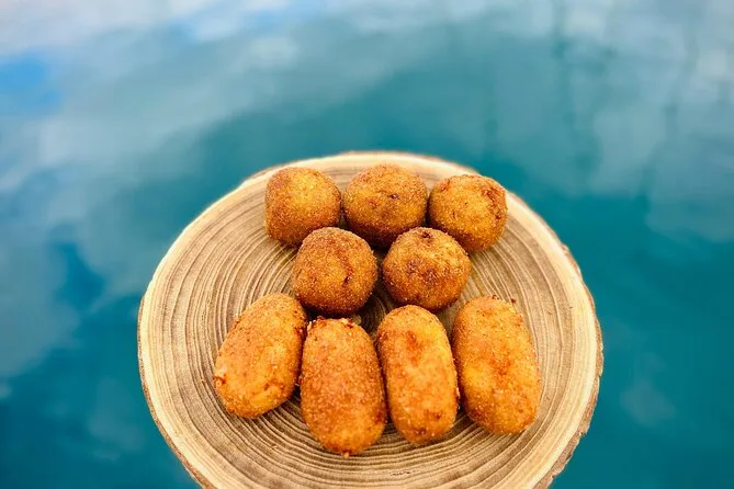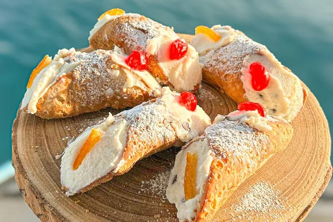 Le bateau a doucement glissé vers la Grotta della Regina — que les locaux appellent la Grotte de la Reine — et Salvo nous a montré les vieilles villas qui bordent la côte, avec ce mélange typique de fierté et de complicité sicilienne, comme s’il partageait un secret. La lumière est devenue rosée, et un gamin a essayé de dire « arancina » mais s’est complètement trompé ; Salvo a ri aux éclats, manquant presque de renverser son Aperol Spritz. On a jeté l’ancre près de la grotte, et il a sorti des plateaux remplis de panelle, sfincione, petites arancine encore chaudes (je me suis brûlé la langue mais je m’en fichais), croquettes et même des cannoli qu’il a garnis sur le pont. Je ne sais pas si c’était l’air salé ou la faim après la baignade, mais tout avait un goût encore plus intense.
