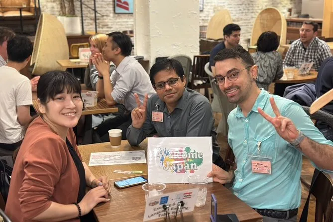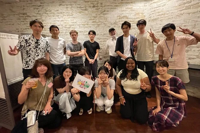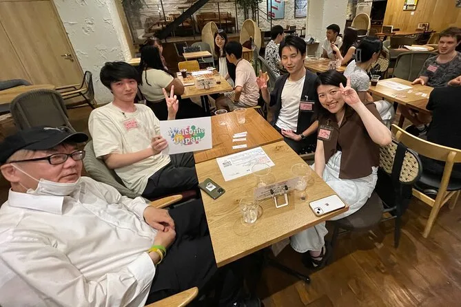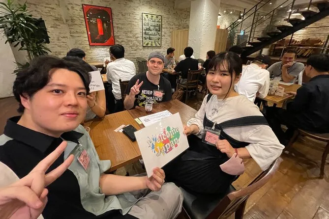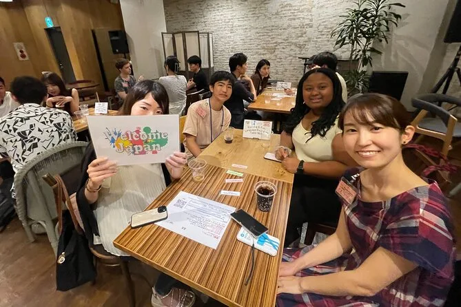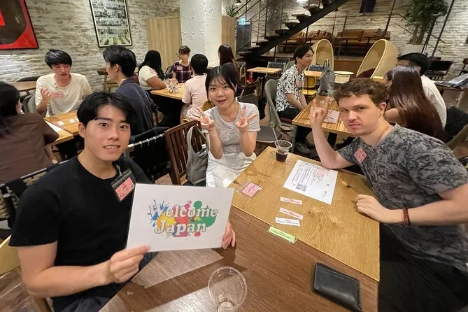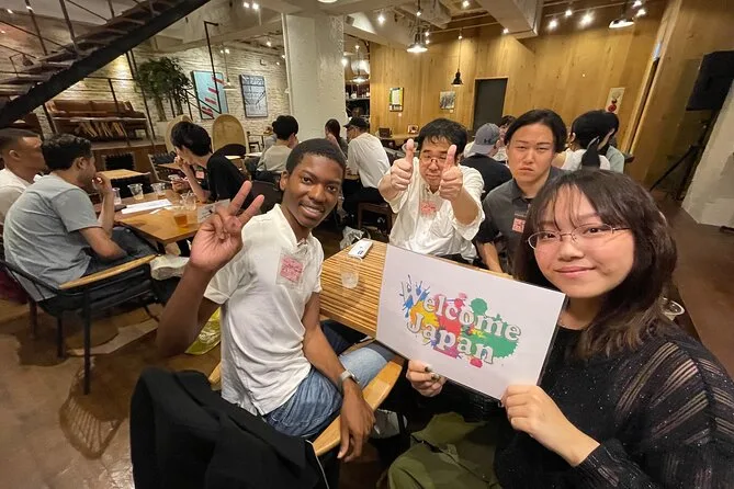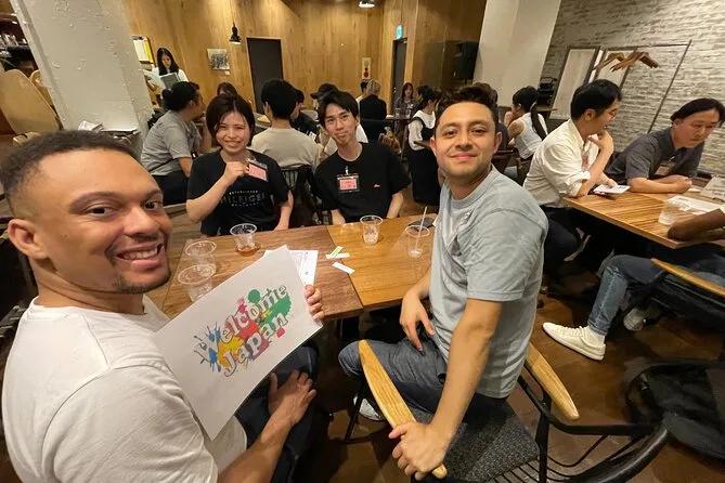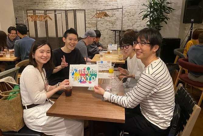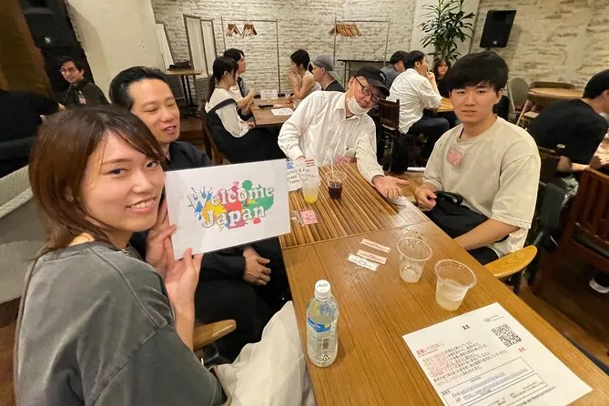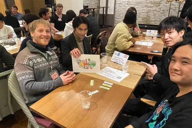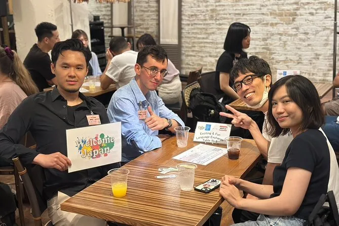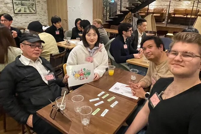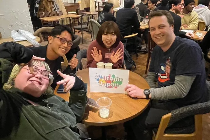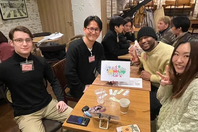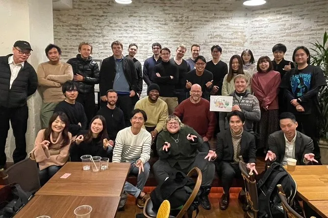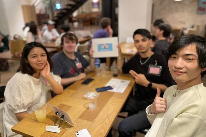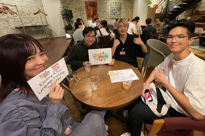 Votre soirée comprend tous les frais d’entrée au café de Shibuya pour l’échange linguistique. Après votre inscription à l’accueil et l’achat de votre boisson, le personnel vous guidera à travers plusieurs sessions de conversation — avec changements de place pour discuter à la fois avec des locaux et des voyageurs — avant de finir par une photo de groupe.
