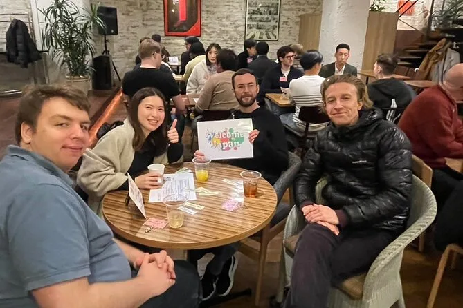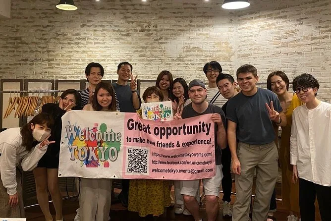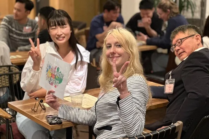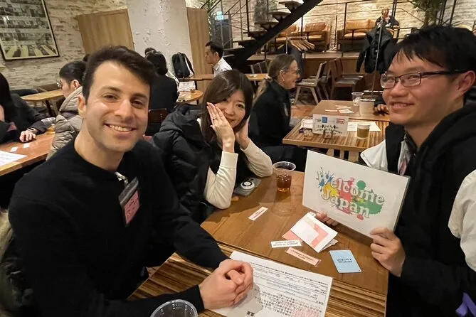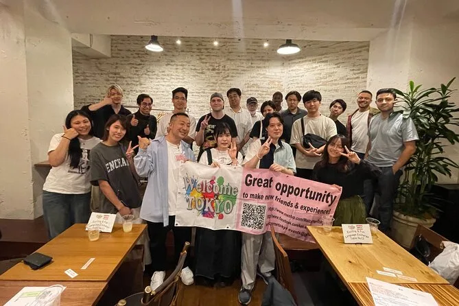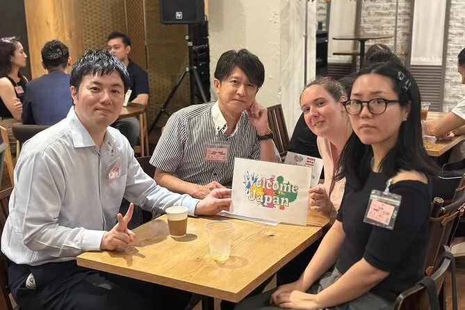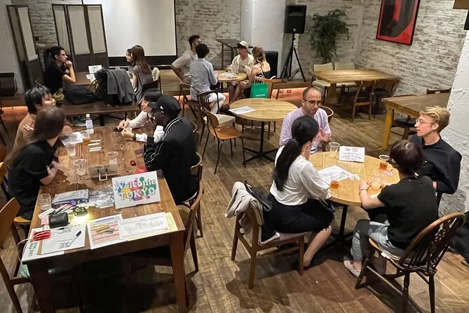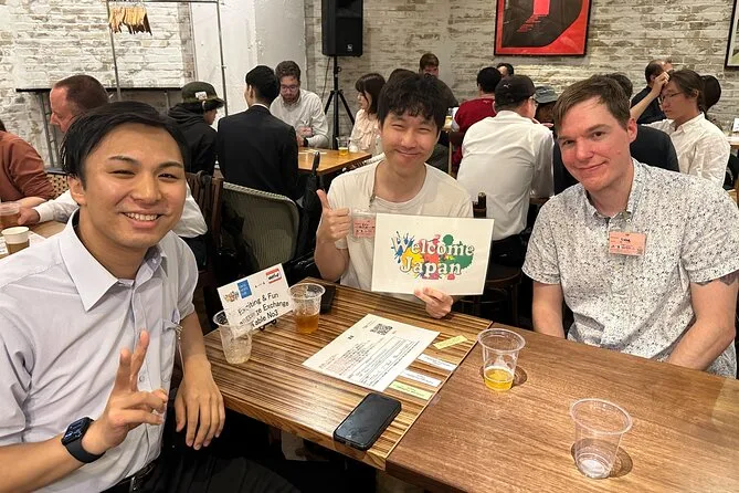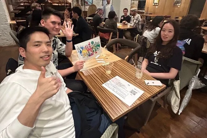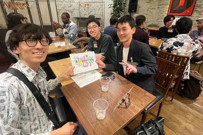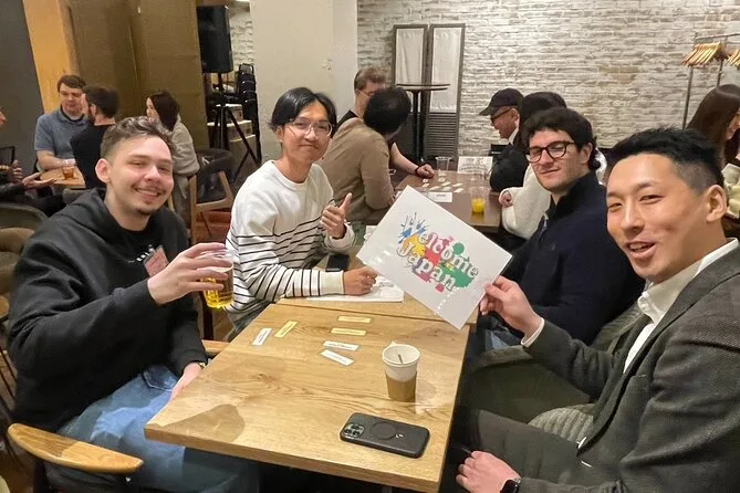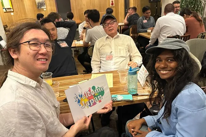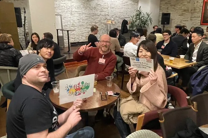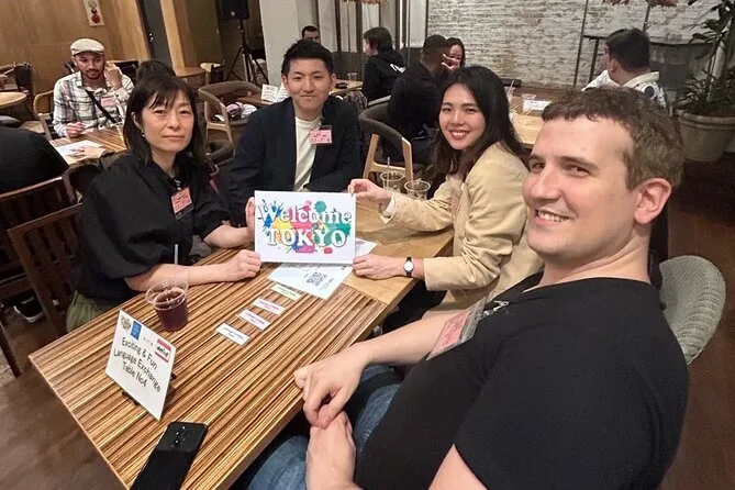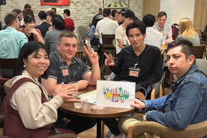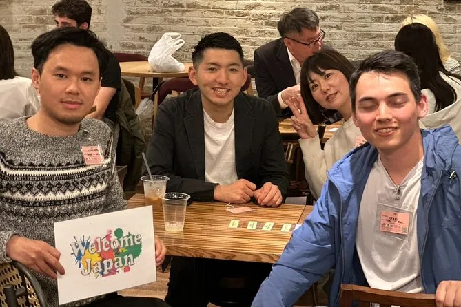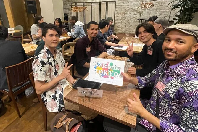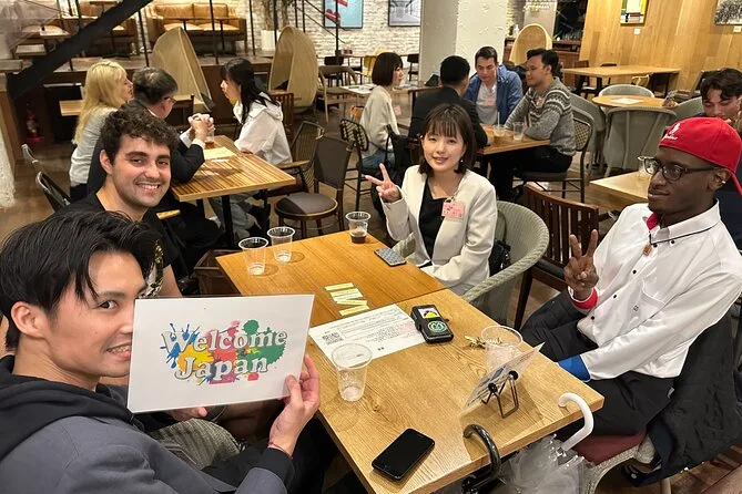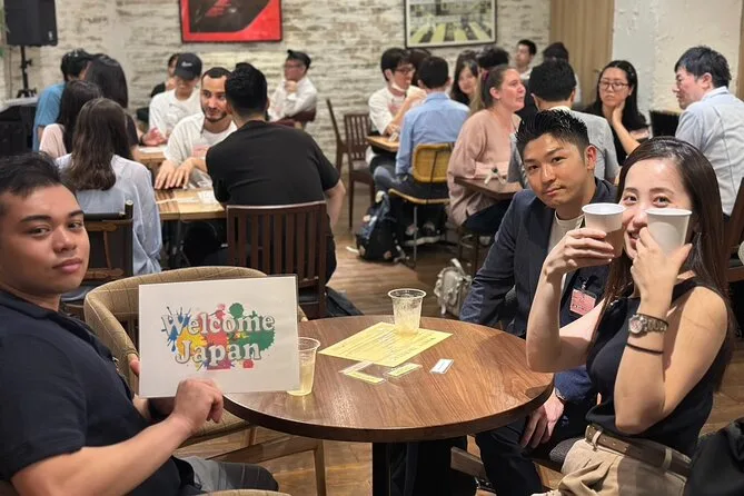 Votre soirée comprend tous les frais d’entrée au café de Shibuya pour l’échange linguistique. Après votre inscription à l’accueil et l’achat de votre boisson, le personnel vous guidera à travers plusieurs sessions de conversation — avec changements de place pour discuter à la fois avec des locaux et des voyageurs — avant de finir par une photo de groupe.