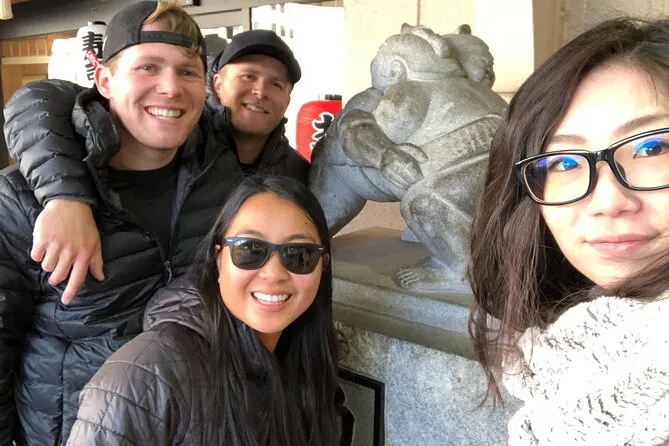 Après, quand on a enfin pu parler, Yuki nous a fait découvrir Ryogoku. Le quartier est vraiment marqué par le sumo — des fresques partout et même la boulangerie avait un lutteur en dessin sur sa vitrine (j’ai essayé de dire « sumopan » mais j’ai sûrement massacré le mot ; Yuki a rigolé). On a pu faire quelques photos de groupe avec deux lutteurs à la fin — ils sont énormes de près, mais étonnamment doux quand ils sourient devant l’appareil. Je repense souvent à ce moment où l’entraînement s’est terminé et que tout le monde s’est incliné ensemble — ça m’a vraiment marqué.