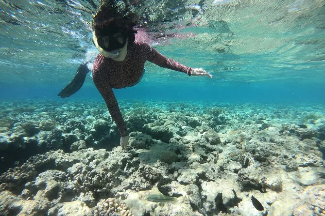 Après une petite introduction — rien de formel, juste l’essentiel avec quelques blagues — nous avons testé la respiration avec les tubas au bord de l’eau. La Mer Rouge est calme le matin, et on voit ses orteils à travers les eaux claires. Quand tout le monde était prêt, nous sommes entrés. La première sensation, c’est la fraîcheur de l’eau sur la peau, puis les éclats de couleurs : des perroquets de mer filant entre les coraux, et avec un peu de chance, une tortue marine qui glisse doucement. Sami a montré l’épave d’un vieux tank, à moitié recouverte de corail mou. Il a pris quelques photos pendant que nous flottions au-dessus. Il veillait sur nous sans jamais nous presser, laissant chacun explorer à son rythme. À la fin, mes doigts étaient tout fripés et je n’avais pas envie de sortir de l’eau.