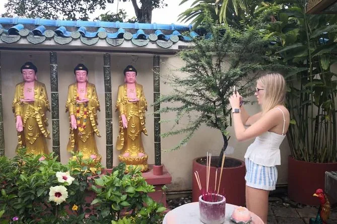 Ensuite, direction le temple Kek Lok Si — un endroit presque irréel avec ses lanternes colorées et l’or partout. Hafiz nous a raconté les histoires bouddhistes derrière les statues pendant qu’on montait des marches qui semblaient interminables (peut-être que je suis juste un peu hors de forme). L’encens flottait dans l’air et une brise légère a enfin coupé la chaleur un instant. Du haut, on voyait George Town s’étendre en contrebas — des voitures miniatures, des toits rouges, et l’océan au loin. Je repense encore parfois à cette vue quand je suis coincé dans les embouteillages chez moi.