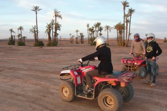 La première chose qui m’a frappé en sortant du van, c’est cette odeur sèche et terreuse de la Palmeraie. Notre guide, Youssef, nous a remis casques et lunettes — il plaisantait sur la poussière, mais il ne mentait pas. Une fois sur le quad, il m’a fallu un instant pour maîtriser l’accélérateur, puis ce fut que du plaisir. Nous avons filé entre les palmiers majestueux et les petites touffes de fleurs sauvages qui survivent ici comme par miracle. Le soleil était chaud sans être écrasant en cette fin de matinée, un temps parfait pour rouler.
