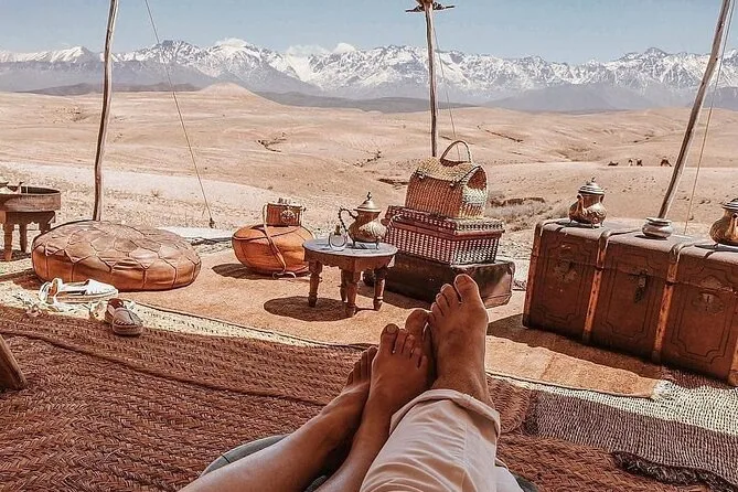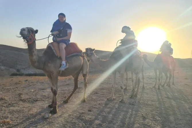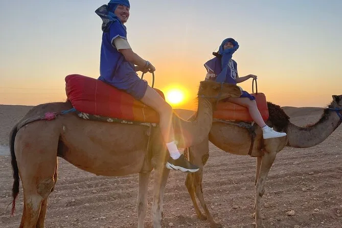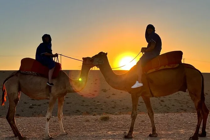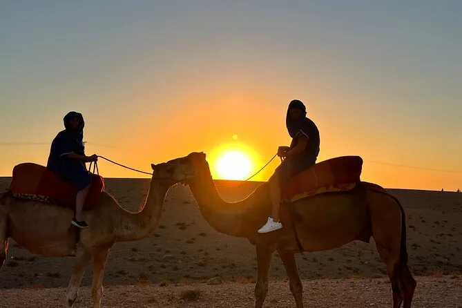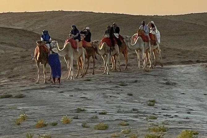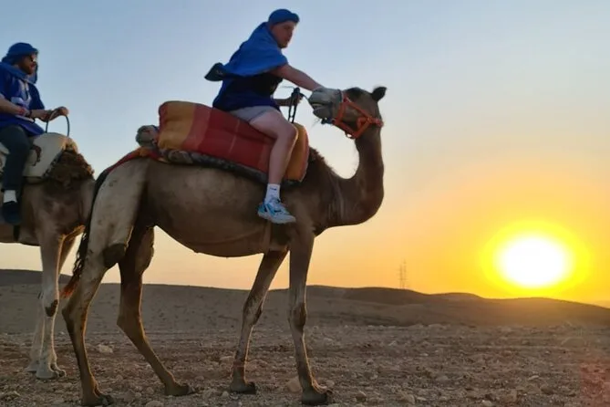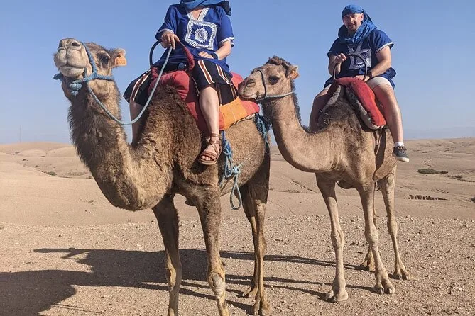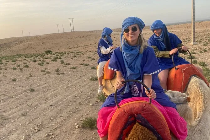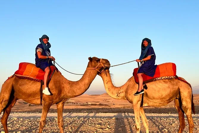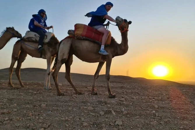 Votre excursion comprend la prise en charge et le retour à l’hôtel à Marrakech (ou un point de rendez-vous proche), un transport privé en véhicule climatisé, une balade d’une heure à dos de chameau dans le désert d’Agafay, un thé à la menthe traditionnel servi dans une tente berbère (haima), ainsi que tout l’équipement nécessaire comme turbans et djellabas.