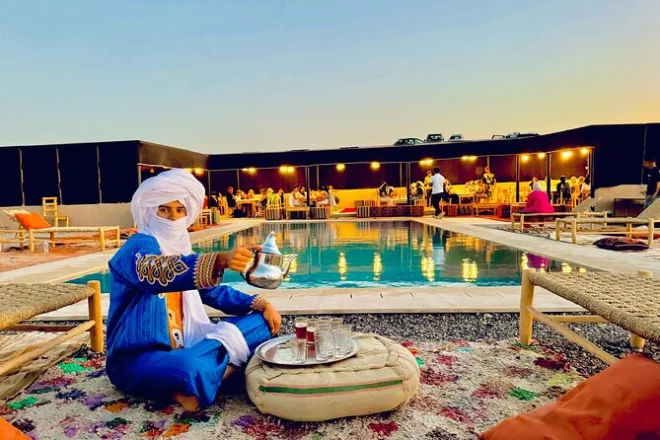 De retour au camp, on s’est réfugiés sous des tentes éclairées à la lanterne. Une femme du coin proposait des tatouages au henné — ses mains étaient rapides et précises — et un plateau de thé à la menthe sucré nous attendait. Certains ont essayé la chicha ; moi, je me suis contenté d’écouter les musiciens s’accorder dehors. Le dîner était un classique : harira fumante, salade fraîche avec des tomates qui avaient vraiment du goût, puis un tajine de poulet mijotant dans des pots en terre. La musique a repris de plus belle après la tombée de la nuit — tambours et chants qui donnaient envie de taper des mains.
