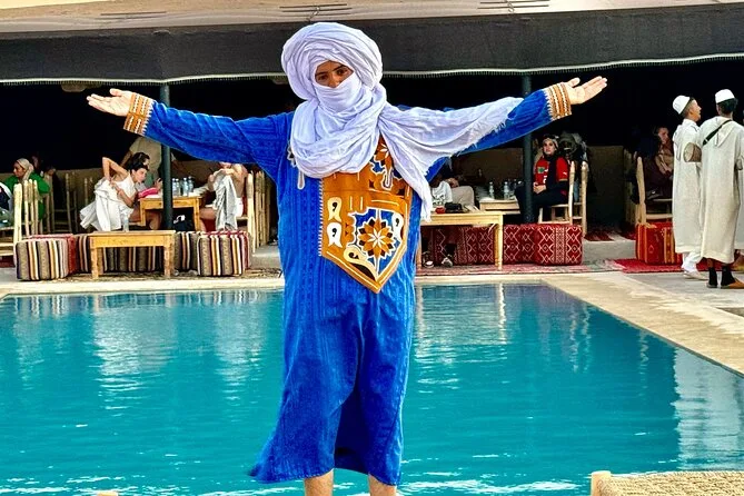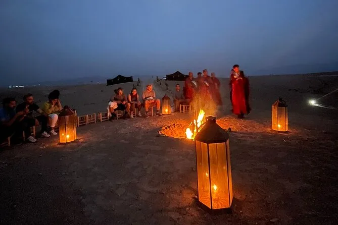 Le départ est vers 16h avec prise en charge à l’hôtel. Vous revenez à Marrakech en soirée après le dîner et la musique — comptez environ 6 heures au total.