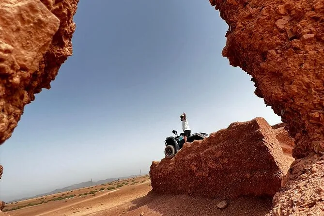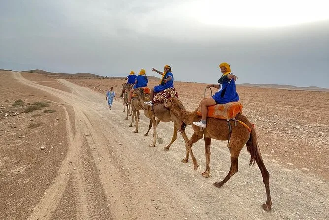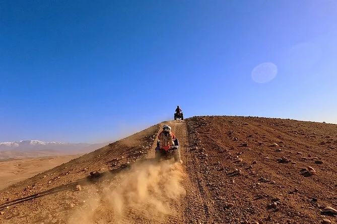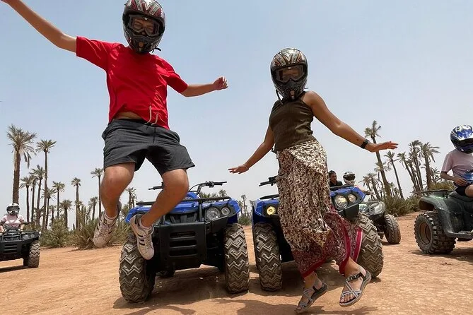 Votre forfait comprend la prise en charge aller-retour à l’hôtel à Marrakech, tout l’équipement pour le quad (lunettes, masque, casquette), une balade guidée en quad d’environ une heure, une randonnée à dos de chameau de 30 minutes au coucher du soleil, une séance de tatouage au henné si vous le souhaitez, une dégustation de chicha au camp, ainsi qu’un dîner marocain complet avec musique live sous les tentes du désert.