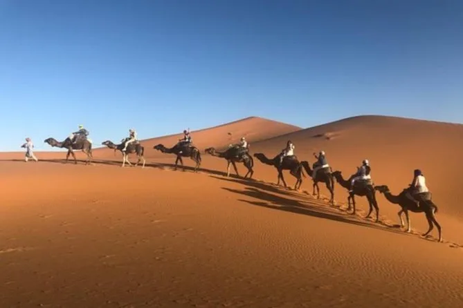 Votre séjour comprend deux nuits d’hébergement (une dans un hôtel kasbah traditionnel, une dans un camp de luxe dans le désert), une balade à dos de chameau au coucher du soleil, un transport climatisé tout au long du parcours, ainsi que la plupart des repas. Des sièges bébé spécialisés sont disponibles sur demande ; il suffit de nous prévenir à l’avance.