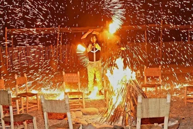 Le dîner s’est déroulé dehors, sous des lanternes basses, dans une ambiance de fumée légère et de musique flottante. Le buffet berbère offrait plus de saveurs que je n’en connaissais — agneau épicé, thé à la menthe sucré, pain plat encore chaud sorti du feu. Il y avait aussi un spectacle ; à un moment, quelqu’un m’a tirée pour danser (je ne sais pas si je les ai plus embarrassés ou si c’est moi qui me suis sentie gênée). Il faisait déjà nuit, à part la lumière dansante des flammes sur les visages. Difficile à décrire, mais on avait l’impression que le temps s’était un peu arrêté là-bas.