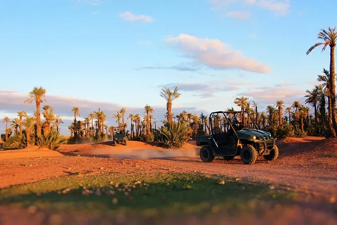 Votre demi-journée comprend la prise en charge et le retour à l’hôtel à Marrakech, l’utilisation d’un buggy deux places avec casque, gants et lunettes fournis par le guide après un briefing sécurité rapide. En chemin, pause dans un village berbère pour un thé marocain frais et des snacks avant de repartir vers la ville — toute l’eau est incluse également.