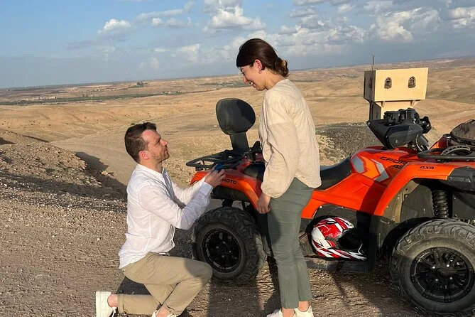 Partez en quad de Lalla Takerkoust à Marrakech jusqu’au désert d’Agafay avec un guide local, en traversant villages berbères et eucalyptus. Faites une pause pour un thé à la menthe traditionnel dans une tente berbère avant de revenir avec une vue panoramique sur le lac et les montagnes — des souvenirs qui restent longtemps après la poussière.